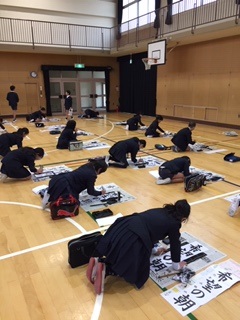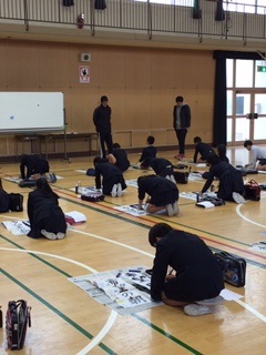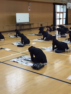 講堂の中で、子ども達は一画一画ていねいに筆を動かし、「希望の朝」を書き上げていました。