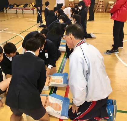 高学年のテーマは「救助活動に参加しよう」ということで、5年生は担架づくり、6年生は心肺蘇生法を体験しました。とても真剣な表情です。