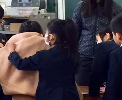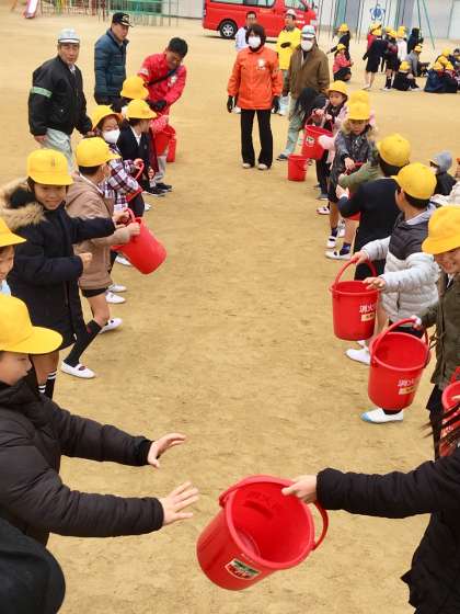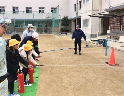 中学年のテーマは「適切な初期対応を身につけよう」で、3年生はバケツリレーを、4年生は水消火器体験と毛布でガウンづくりを行いました。