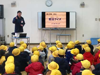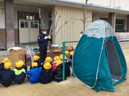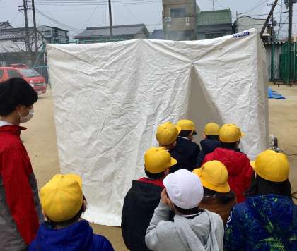 低学年のテーマは「防災に関心をもとう」で、1年生は消防車両と備蓄用品の見学、2年生は煙体験と防災クイズでした。消防車両については緊急出動があり、残念ながらゆっくり見ることができませんでした。