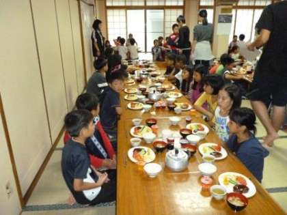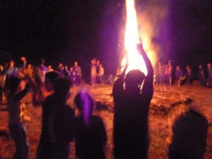 夕食は、ハンバーグでした。夕食後キャンプファイアーをしました。校長先生の火の神です。ファイアーを囲んで楽しいひと時を過ごしました。