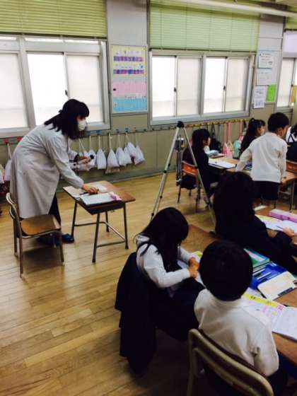 授業中のCO2濃度や、教室の明るさ、スクリーンを使った場合など、調べていただきました。