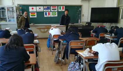皆、顔をふせていますが、これは、ミッシングゲームをしている様子です。英語を使って、海外のいろいろな国名を言い当てます。