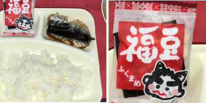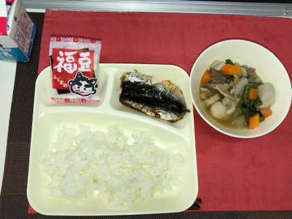 節分の行事献立でした。いわしは開きなので骨も少なくタレも甘く児童にも好評でした。