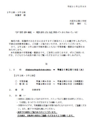 2年2組・3年2組 学習参観・懇談会延期のお知らせH31.2.6(水)