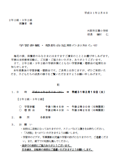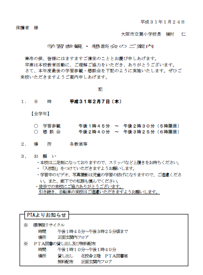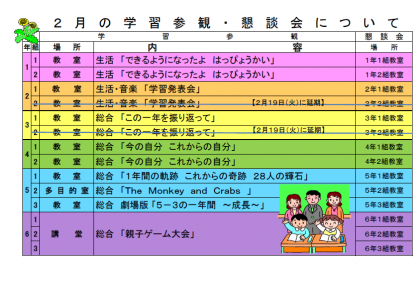明日2月7日(木)に行われる「学習参観・懇談会」の案内文と場所・学習内容一覧表を載せました。ご覧ください。