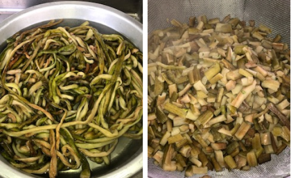 ずいきとはサトイモ類の葉柄で、「いもがら」「わりな」「ずきかんぴょう」とも称します。灰汁がつよいので茹でてから調理しています。給食ではみそ汁の他、煮物等にも使用しています。