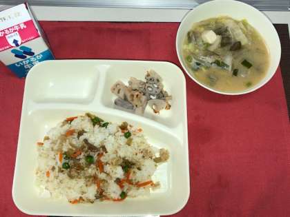 巽小学校では委託米飯なので、喫食時に各自お皿の上で具材と混ぜ合わせます。