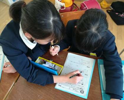 2月6日(水)の様子です。時折、こうして互いに分からないところを教えあう様子が見受けられます。教えてもらう側はもちろんのこと、教える側も2度学ぶことになり、より一層の知識の定着につながります。