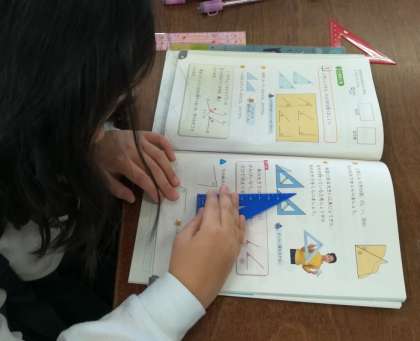 「三角形を調べよう」の単元を学習しています。三角定規を使って角度を調べたり、コンパスを使って、二等辺三角形や正三角形を描いて、特徴を確認しました。
