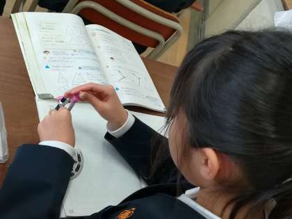 「三角形を調べよう」の単元を学習しています。コンパスを使って一辺の長さを測り、どんな特徴をもつ三角形か調べます。