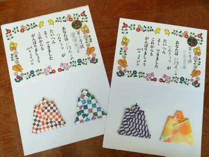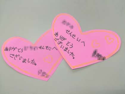 今日は、全25回の日本語学習の最終日でした。これまで頑張ってきた二人には、先生からは「修了証」が手渡されました。お返しに、子ども達は感謝の気持ちをこめてカードを書きました。