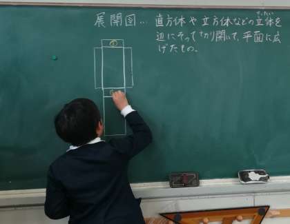 「箱の形を調べよう」の単元を学習しています。ティッシュペーパーの箱をそれぞれの辺にそってハサミで切り、展開図にします。向かい合っているどうしの面に印をつけ、直方体になった形を推測します。