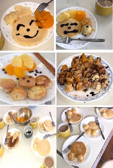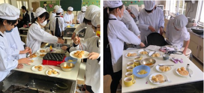 今日は、5年3組の調理実習でした。単元名は「家族でホットタイム」です。ホットケーキミックスを使用し、班で考えたおやつを作っていました。みんな色々アレンジして食べるのももったいないくらい可愛らしくできあがっていました。