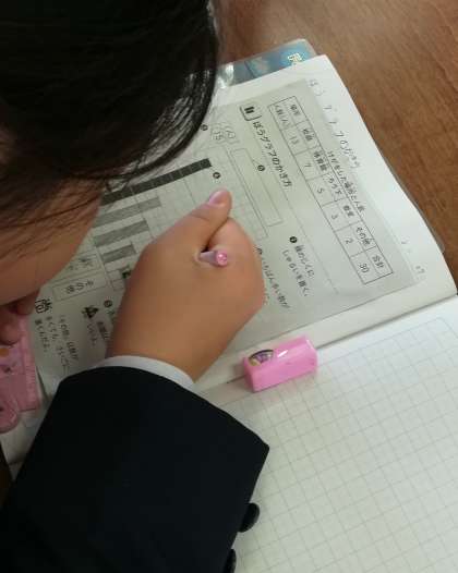 「見やすく整理して表そう」の単元を学習しています。実際にノートに書きこんでいくことにより、グラフや表を正しく読み取る力がはぐくまれていきます。