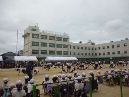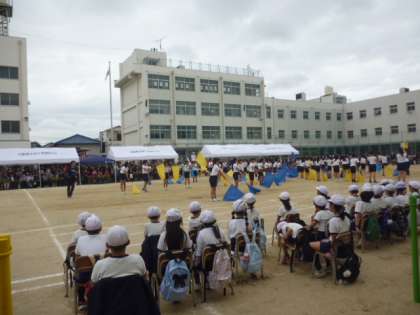 いよいよ花形、6年生の団体演技「一致団結〜未来の風にのせて〜」です。フラッグを使った動き、体だけの動き、全体の動きのバリエーションもあり、まさに、一致団結!みんなで作り上げてきた様子が伝わってきました。とても見ごたえがありました。