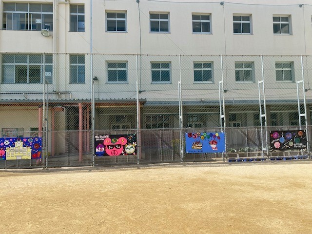 各学年とあゆみ学級で作成した「まとあてボード」を運動場に掲示しました。