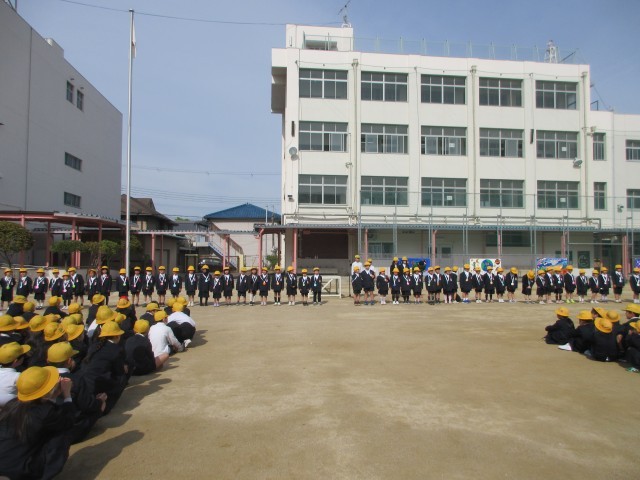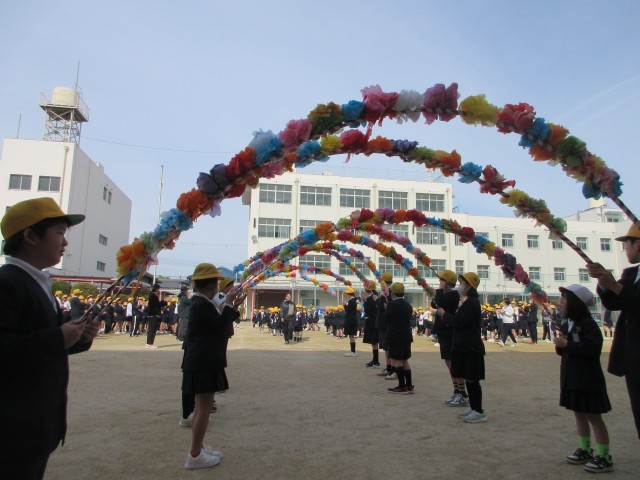 1年生を迎える会を行いました。花のアーチを通ってかわいらしい1年生が入場してくると、自然にみんな笑顔になりました。2年生がお祝いに作ったメダルをかけてくれました。朝顔の種入りです。2年生から6年生は優しく教えてあげてください、と1年生の先生からお話があり、1年生みんなで「よろしくお願いします。」と言いました。これから仲良く、遊んだり、運動したりしていきましょう。