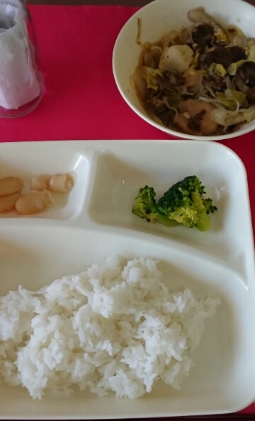 今日の献立は、 ● すき焼き煮 ● ブロッコリーのしょうがづけ ● 大福豆の煮も...