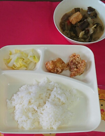 今日の献立は、 ● 鶏肉のたつた揚げ ● あつあげと干しずいきのみそ煮 ● はく...