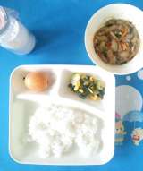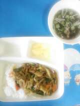 今日の献立は、 ● 和風カレー丼 ● モズクとオクラのとろり汁 ● りんご(缶)...