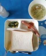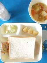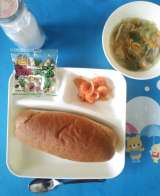今日の献立は、 ● ウィンナ−のケチャップソース ● スープ ● 三度豆とコーン...