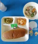 今日の献立は、 ● えびのチリソース ● 中華スープ ● 豆こんぶ ● パン ●...