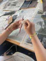 鉛筆を使って磨いている子や折り曲げて器用に磨いています。 また、2枚目のサンドペ...