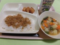 ・鶏ごぼうご飯【きざみのり】 ・みそ汁 ・焼きれんこん ・牛乳 です。