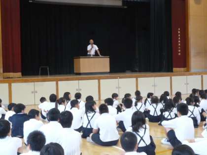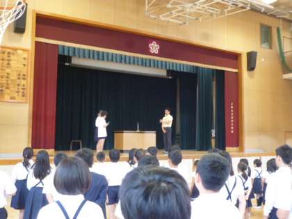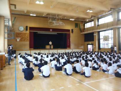 今日の集会では、まず初めに区役所の薮野さんが交通安全の協力依頼に来られました。元気よく、挨拶をしましょうと呼びかけてくれました。その後、児童代表より一生懸命勉強とスポーツをがんばっていくことが恩返しになると思います、と力強く言ってくれました。次に校長先生からいじめについてのお話がありました。ドッジボールにくぎが刺さったら、元に戻らないように、言葉で相手を傷つけると、心の傷はずっと残るというお話でした。そして、何かあれば、必ず周りの大人に助けを求めてくださいということでした。