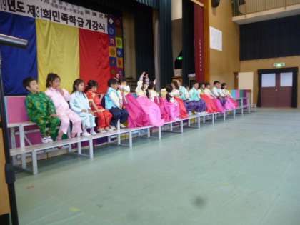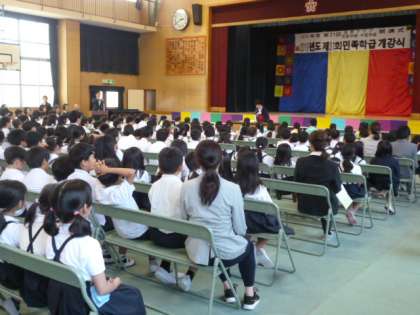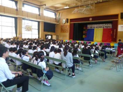 第31回国際クラブ 民族学級・中国学級の開校式がありました。本年度、民族学級が15人、中国学級が4人の1年生の児童が新たに仲間に加わりました。