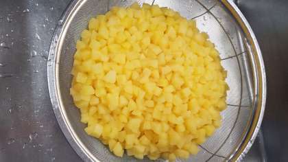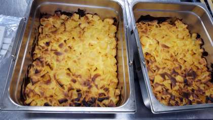 りんごのクラフティは、小麦粉、鶏卵、生クリーム、砂糖をまぜたものと、青森県産のりんごの缶詰を合わせて、コーンフレークを敷いたバットに流し入れて焼き上げたものです。給食では、白桃の缶詰を使う時もあります。子どもたちにとても人気のデザートです。
