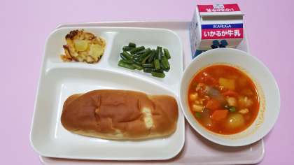 ★ケチャップ煮・三度豆のソテー・りんごのクラフティ・おさつパン・牛乳