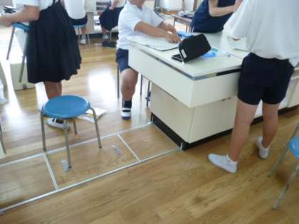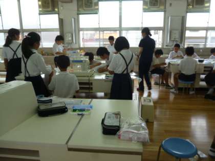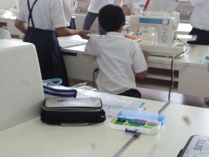 今日は家庭科室で昨日の続きで、ナップサックをつくっています。今日はミシンも使っています。