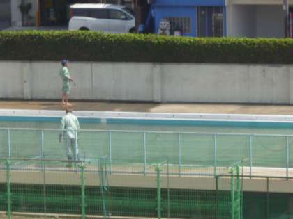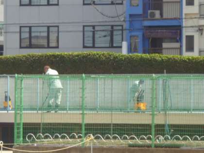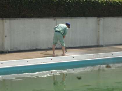 もうすぐ、プールが始まります。暑い中、管理作業員さんが、プールを掃除してくれています。みんないっぱい泳いでね。