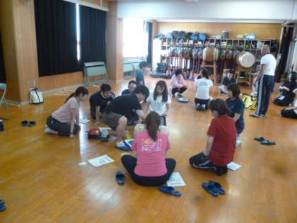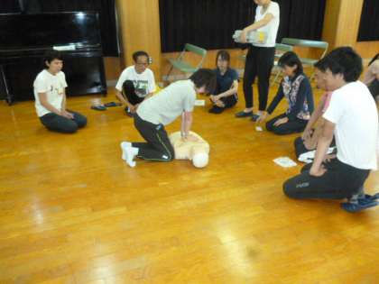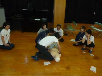 はじめはVTRを見ながらの講義形式で、後半は実際に人形と練習用AEDを使用して行いました。