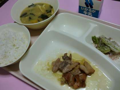 ★鶏肉の甘辛焼き・みそ汁・キャベツの赤じそあえ・ご飯・牛乳