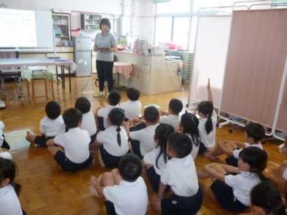 1年生は体重測定です。体重測定の前に保健室の先生から、睡眠についての大切なお話がありました。たくさん食べて、よく眠って、運動して大きくなってね。
