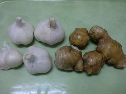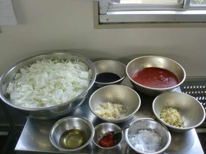 1枚目の写真は、小学校分のチリソースに使う、にんにくとしょうがです。今日はたっぷり使っています。2枚目の写真は、チリソースに使っている材料です。