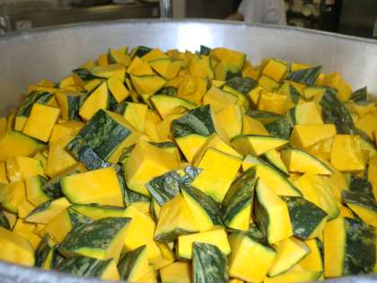 かぼちゃのクリームシチューは、旬のかぼちゃを小学校分で11個も使用しました!