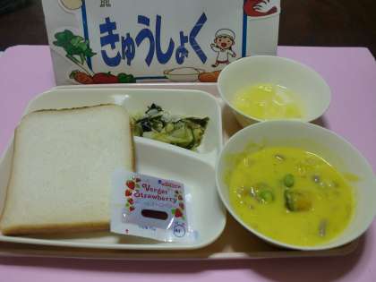 ★かぼちゃのクリームシチュー・ミックス海草のサラダ・りんご(缶)・いちごジャム・食パン・牛乳