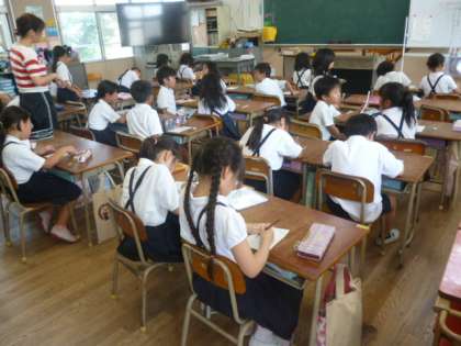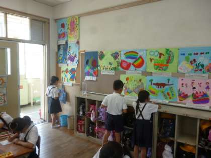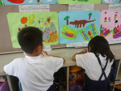 図工の授業で、お互いの絵を鑑賞し、鑑賞カードに感想を書いていました。友達のいいところを言い合えました。