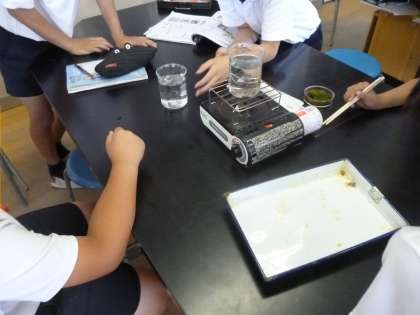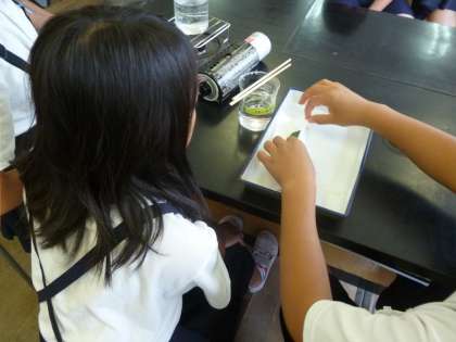 理科では、実験を行いました。植物の葉がどのような働きをしているのかをヨウ素液を使って調べました。