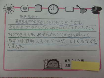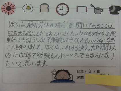 6月21日に第1回学校保健委員会で堺市立三原台中学校の藤井先生に睡眠の授業をしていただきました。6年生の感想から、睡眠についてしっかり学べていたことが分かります。お家でもお子さんと一緒に就寝時間について話し合っていただきたと思います。