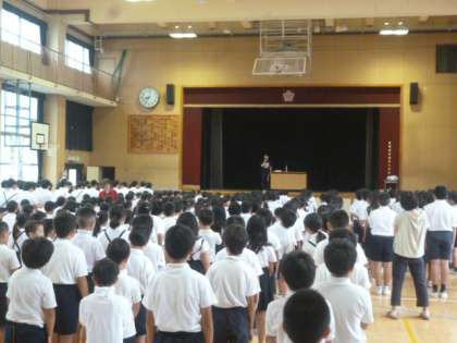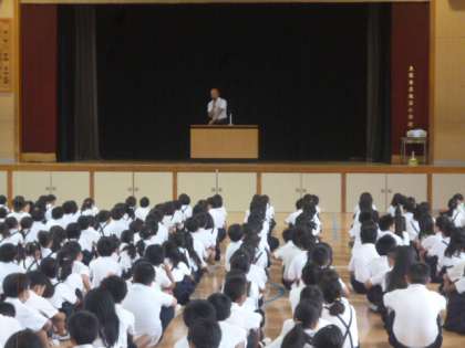 暑さで気の弛みから事故の起きやすい時期ということで、7月1日は国民安全の日です。雨が続くので、本を読むなど、休み時間の過ごし方に気をつけましょう。また、1年のちょうど真ん中にあたり、最初に立てた目標を振り返るいい機会にしてください。というお話がありました。