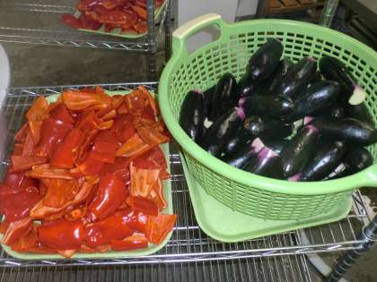 鶏肉と夏野菜のソテーには、トマト(缶)、なす、きゅうり、赤ピーマンなどの夏野菜を使っています。赤ピーマンは、普通の緑のピーマンを畑で熟するまでおいて収穫したもので、緑のものより栄養価が高いです。オリーブ油で、炒めて砂糖、塩、こしょう、ワインビネガーでさっぱりした味付けに仕上げています。