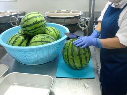 「すいか」は、中心の美味しい部分を均等にいきわたるように、1つのすいかを1/64に切っています。赤い部分が全部なくなるまで、種まで食べた子もいました。「たねまで食べちゃったけど、おなかの中にすいかはできへんよね?」と確かめにくる子もいましたよ! 今日のすいかは鳥取県産のものです。