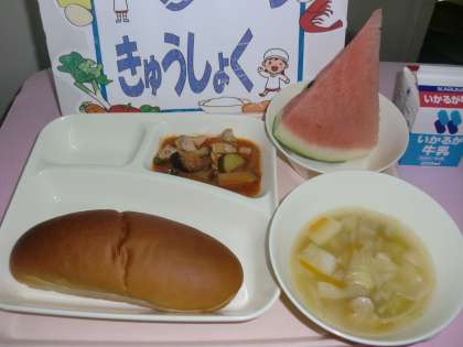 ★鶏肉と夏野菜のソテー・押し麦のスープ・すいか・黒糖パン・牛乳