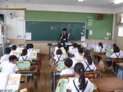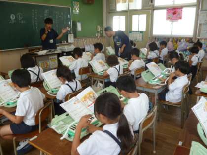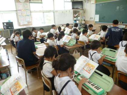 鍵盤ハーモニカを練習中です。いろいろなリズムの取り方を学習し、ペアで確認しています。
