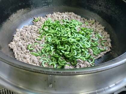「ゴーヤチャンプルー」は沖縄の有名な料理です。給食では、豚肉やもやしと一緒に炒めています。食べる前にかつお節をかけていただきますので、子どもたちが苦手な「苦味」も薄れて、残さず食べてくれていますょ。